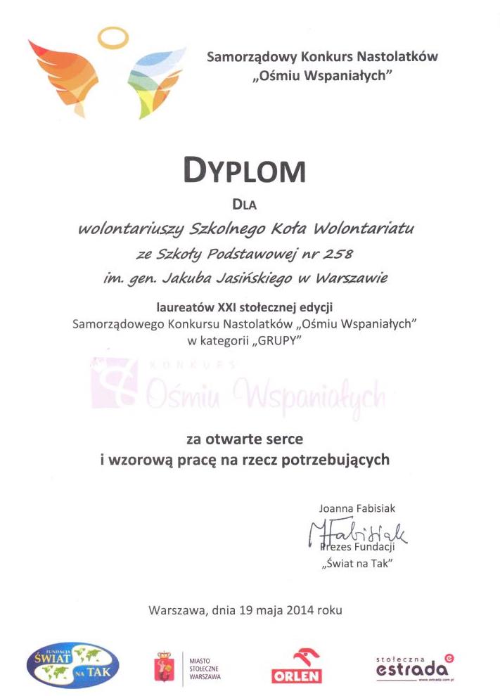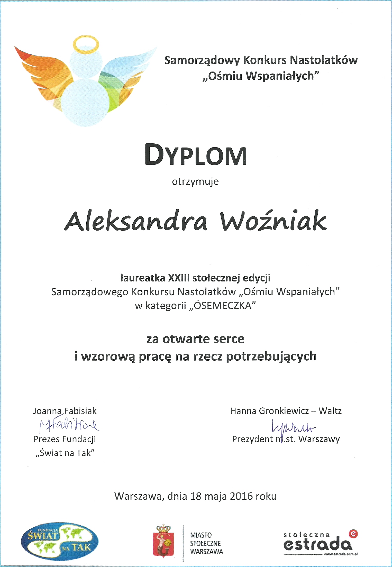 Uczennice klasy VIA: Bajor Maria, Brzoskwinia Julia, Kochańska Angelika, Grudzińska Aleksandra, Tchepilev Angelina, Trojanek Weronika, Urbanik Maria, Widlak Wiktoria, Woźniak Julia oraz Ziemak Magdalena działające jako grupa Szkolnego Koła Wolontariatu, zostały laureatkami XXI Stołecznej Edycji Samorządowego Konkursu Nastolatków „Ośmiu Wspaniałych”.
