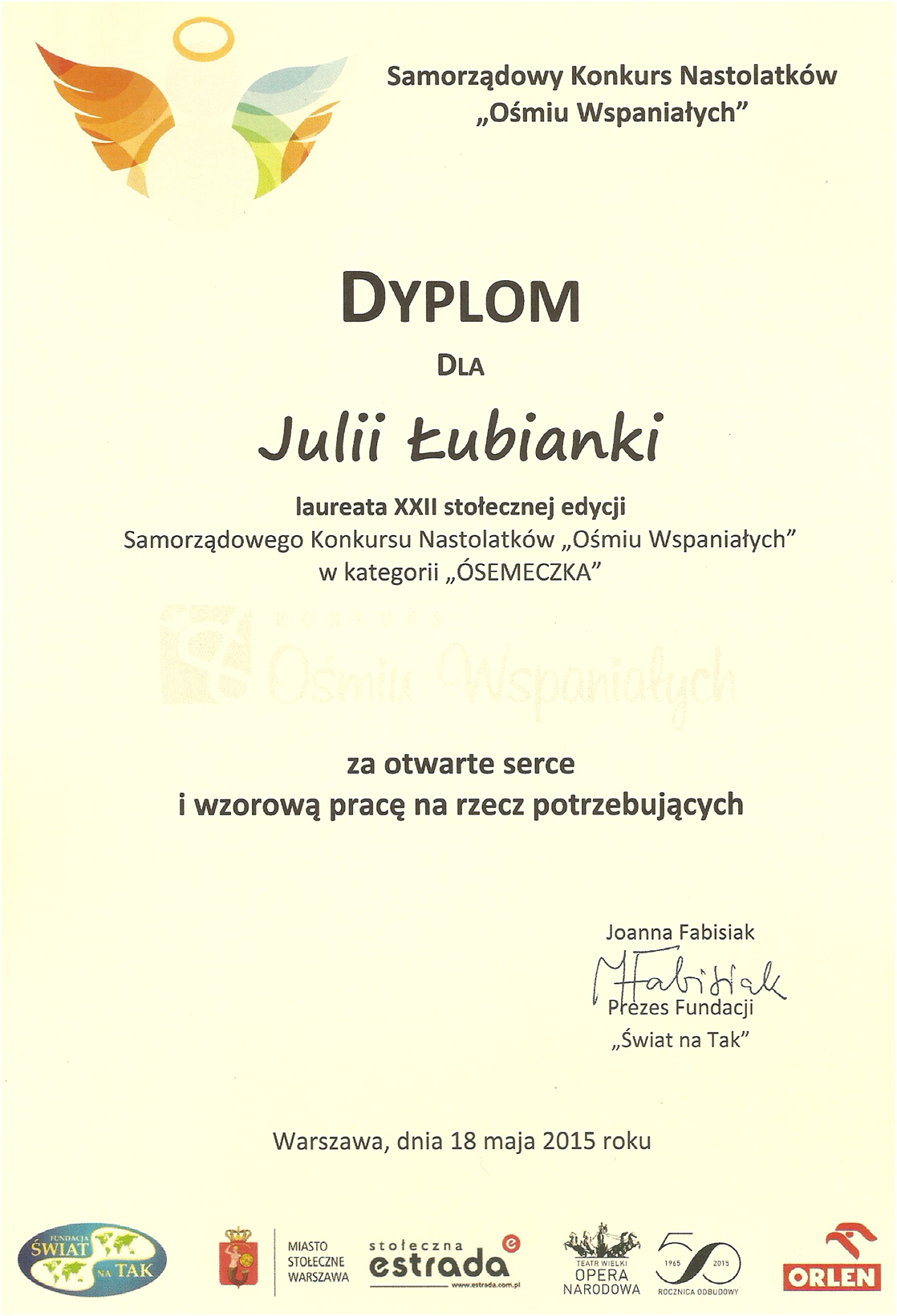 Z ogromną radością informujemy, że Julia Łubianka, uczennica klasy V B i członkini Szkolnego Koła Wolontariatu, została laureatką XXII Stołecznej Edycji Samorządowego Konkursu Nastolatków "Ośmiu Wspaniałych". Razem z Julią uczestniczyliśmy w uroczystej gali wręczenia nagród, która odbyła się 18 maja w Teatrze Wielkim. Prezydent Warszawy Hanna Gronkiewicz- Waltz była obecna na uroczystości. Na zakończenie gali obejrzeliśmy niesamowity występ aktorów z Teatru Roma.